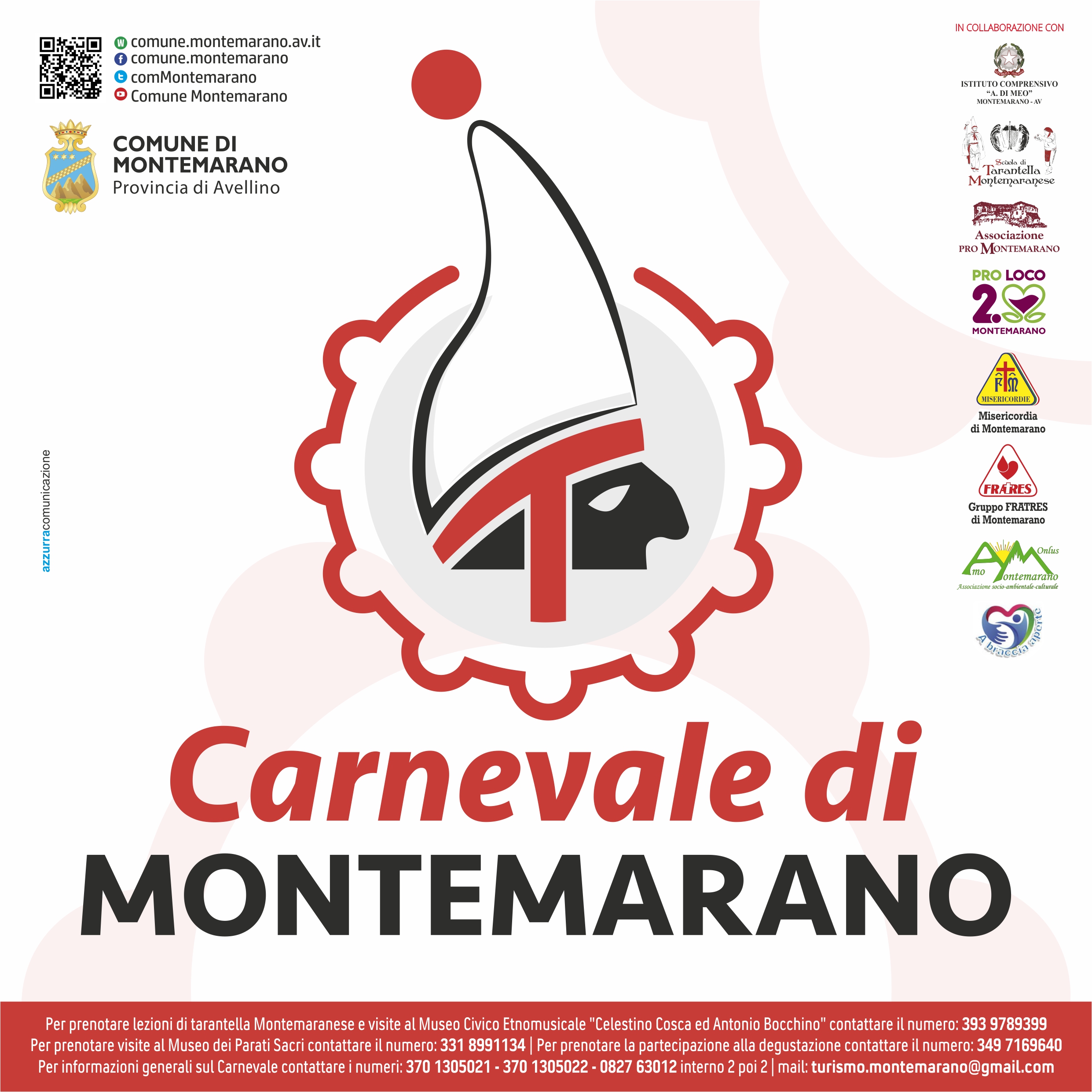 Carnevale di Montemarano - 17•18•19•20•21•25•26 FEBBRAIO 2023 VENERDI 17 FEBBRAIO Ore 21:30 "Carnevale delle culture" Auditorium Comunale Concerto Piazza Irpinia con Antonio Modano, Massimo Vietri, Gioacchino Acierno, Eustachio Frongillo, Vito Raosa, Andrea Saldutti, Francesco Mercadante e Valter Vivarelli a cura della scuola di tarantella montemaranese SABATO 18 FEBBRAIO Ore 16:00 Incontro Culturale: "Montemarano, Carnevale Globale" Auditorium Comunale a cura dell'Ass. Scuola di Tarantella Ore 17:30 "Caporabballo d'Argento" Palazzo Castello a cura dell'Ass. Pro-Montemarano Ore 22:00 "0 Vanto e Sfida" sfilata in notturna per le vie del Paese DOMENICA 19 FEBBRAIO Ore 10:00 Sfilata dei bambini del locale plesso scolastico per le vie del Paese a cura della scuola dell'infanzia, primaria, secondaria dell'Istituto Comprensivo A. Di Meo e del Centro per l'infanzia Comunale di Montemarano Interverrà il Gruppo Folcloristico "Zampa Cardillo" dell'Ass, Pro-Montemarano Ore 11:00 Apertura del Carnevale Saluto e discorso augurale del Sindaco di Montemarano Piazza del Popolo Ore 11:30 "Lezioni di tarantella Montemaranese" Palazzo Castello a cura della scuola di tarantella montemaranese Ore 15:30 "Tradizionali sfilate dei cortei mascherati" per le vie del Paese Ore 21:30 Musica Popolare in Piazza Mercato LUNEDÌ 20 FEBBRAIO Ore 16:30 "Tradizionali sfilate dei cortei mascherati" per le vie del Paese Ore 21:30 Musica Popolare in Piazza Mercato MARTEDI 21 FEBBRAIO Ore 10:00 "Lezioni di tarantella Montemaranese" Palazzo Castello a cura della scuola di tarantella montemaranese Ore 15:30 "Tradizionali sfilate dei cortei mascherati" per le vie del Paese Ore 21:30 Musica Popolare in Piazza Mercato SABATO 25 FEBBRAIO Ore 18:00 L'Aglianico e il Taurasi in degustazione nella terra del "Grande Rosso", tra carnevale e sonorità dell'anima e del cuore a cura dell'Amministrazione Comunale in collaborazione con A.I.S. Campania, Ass. Pro loco 2.0 e le cantine di Montemarano Palazzo Castello DOMENICA 26 FEBBRAIO Ore 10:00 "Lezioni di tarantella Montemaranese" Palazzo Castello a cura della scuola di tarantella montemaranese Ore 16:00 "Carnevale Morto Corteo funebre di carnevale e successiva lettura del testamento" per le vie del Paese Ore 21:30 Musica Popolare in Piazza Mercato SARÀ ALLESTITA LA PIAZZA DEL GUSTO CON STAND ENOGASTRONOMICI IN PIAZZA MERCATO Allegati: