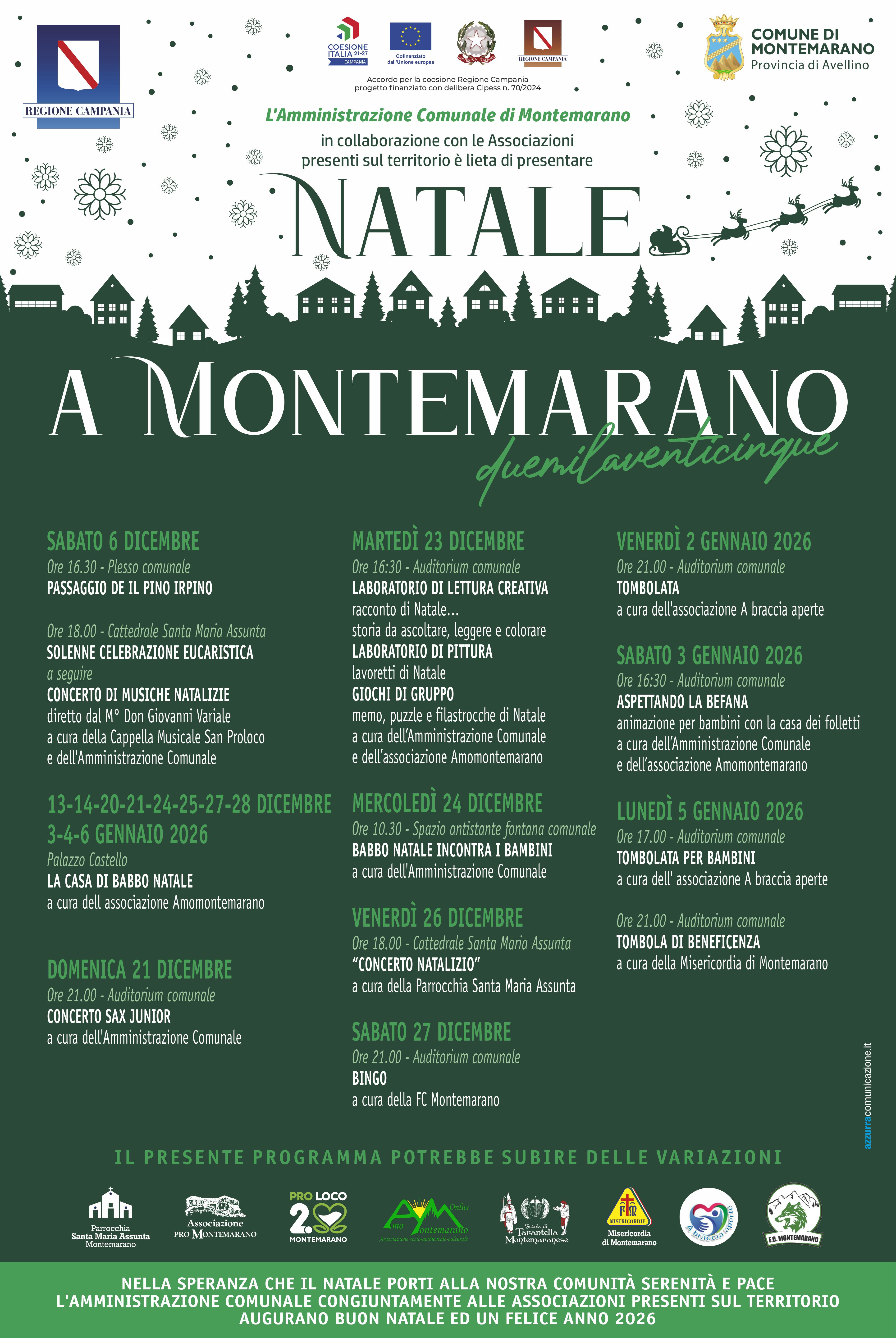 L''Amministrazione Comunale di Montemarano, in collaborazione con la Parrocchia "Santa Maria Assunta" e le Associazioni presenti sul territorio, è lieta di presentare: “Natale a Montemarano 2025".