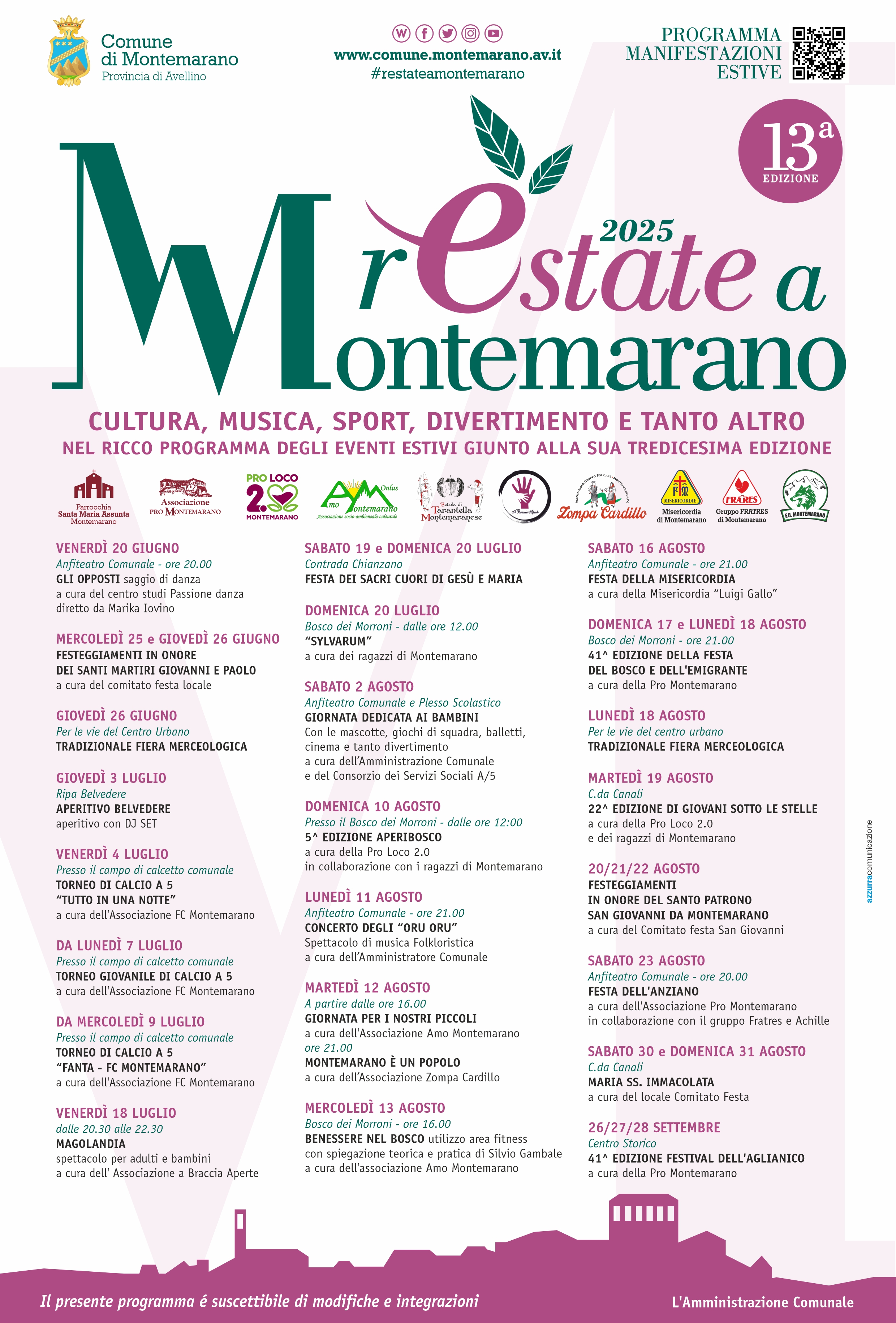 Di seguito il programma completo delle manifestazioni previste per l'estate 2025 "rEstate a Montemarano", giunto ormai alla sua 13° edizione, voluto dall'Amministraizone Comunale e grazie al contributo dellla Parrocchia, dei comitati festa, delle Associazioni e di tutti i giovani che hanno concorso ad allestirlo